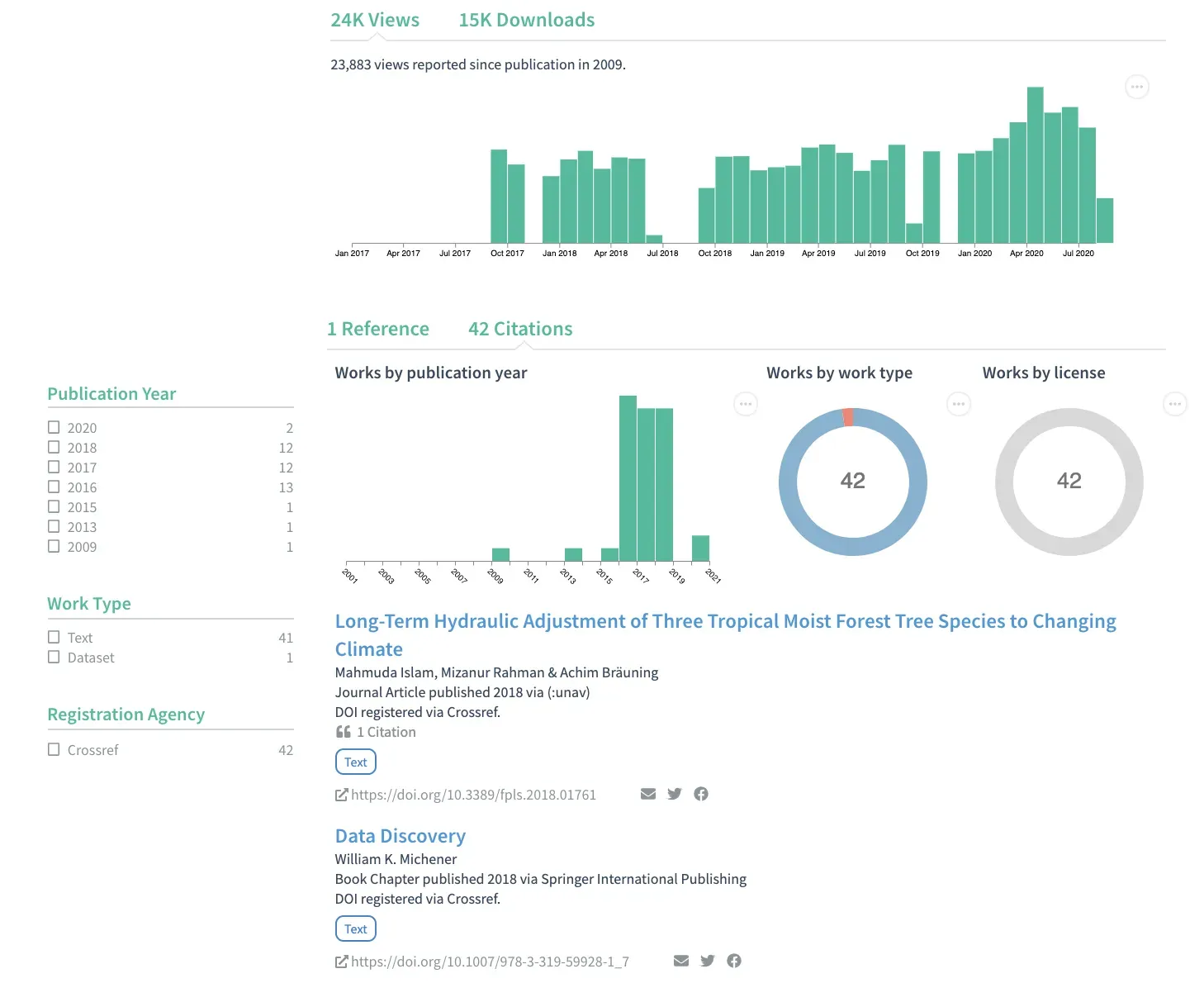 For a single work, e.g. the dataset registered with DOI https://doi.org/10.5061/dryad.234, we show views, downloads and citations if available: