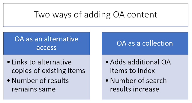 My attempt to delineate the two different ways of adding OA content, is also echoed somewhat in this recent OCLC talk.