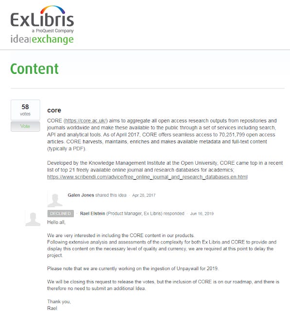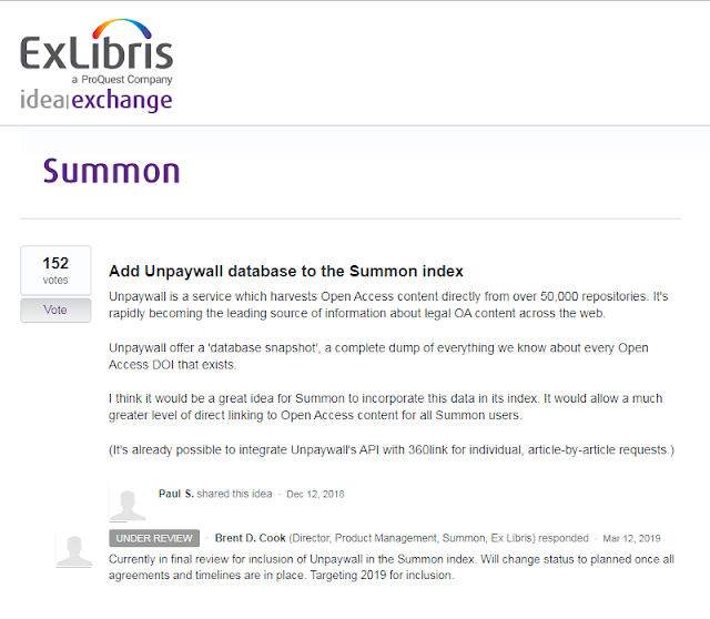 The way some of the feature requests particularly that for Unpaywall - "Add Unpaywall database to the Summon index" makes it hard for me to tell if the request is for using Unpaywall to enhance the existing index records with OA status and links or if it is for ingesting the whole database so librarians can add everything as a collection so the whole 20 million or so records in Unpaywall is searchable. I suspect it is for the later (and maybe together with former).
