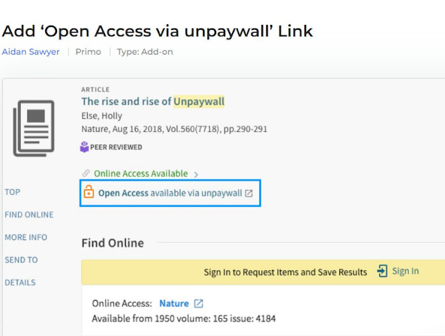 For example, this nifty Primo Unpaywall Plugin (below) is embedded into Primo such that whenever a user loads a Primo record in the search result page or item display page, it will automatically call Unpaywall API to check for copies and displays it in real time.