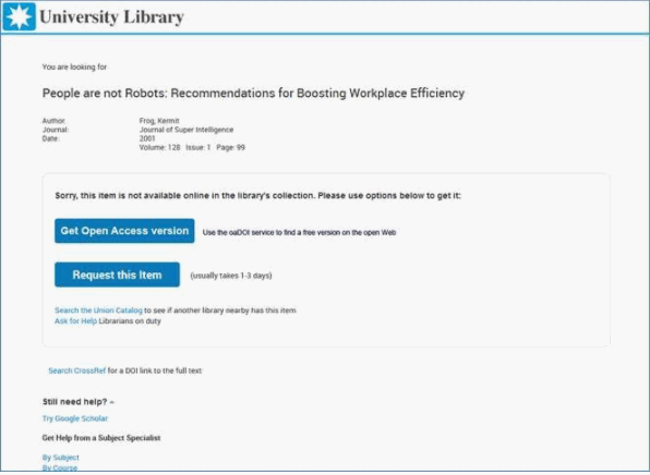 This is why Unpaywall integration in Link resolvers are more commonly seen. In the example below, the Unpaywall API is only called when the link resolver determines there is no available full text via other sources.
