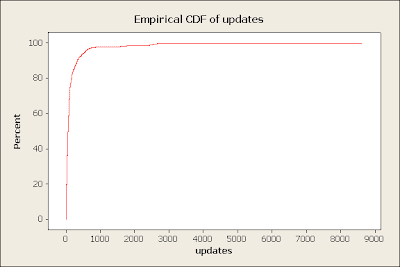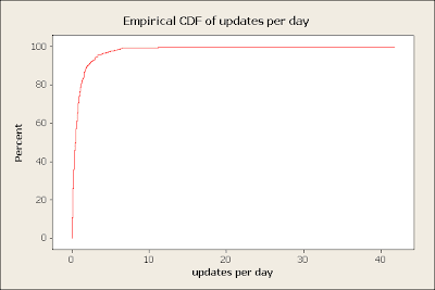 The twitter library accounts generally don't update a lot. 95% of accounts update less than 3 times daily. Note that update per day is calculated by taking total updates divided by the age of the account. Some accounts are dormant for a while before they become really active, so this statistic probably understates the current updates per day.