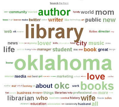 What type of accounts are library Twitter accounts following? The following word cloud of the bios of the followers of a Library in Oklahma (via Twittersheep) is quite typical.
