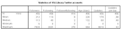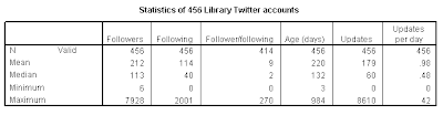 After posting about what Library Twitter accounts are doing here and here, I stumbled upon a more efficient way of getting the statistics and this resulted in the following batch of statistics (Number of followers, Number of following, Followers/following ratio, Age of account (based on first tweet) and total updates for all 456 accounts on the Library Twitter League.