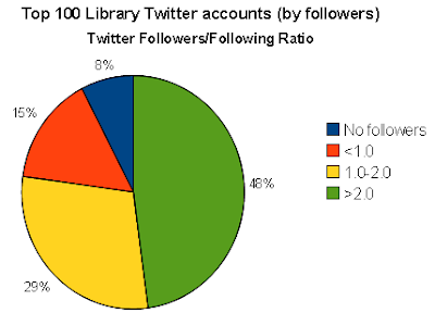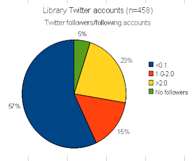 It seems that a majority (57%) of Library Twitter accounts have less followers then those following them! 5% had no followers and the rest had more followers than following.