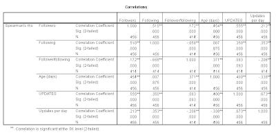 One statistic, I calculated in an earlier blog post was Twitter follower/following ratio or more formally named Twitter Follower-Friend Ratio (TFF)