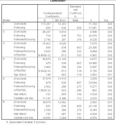 Multi-linear regression (stepwise) was carried out with number of followers as the dependent variable, and the other statistics as independent variable.