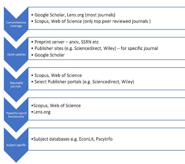 Note : I focus mostly on journal-article type literature reviews, if the user is looking for news-types, datasets, business resources or even books it is mostly out of scope for this article. This blog post also is addressed to librarians and advanced researchers who really want to understand search sources and not for average users....